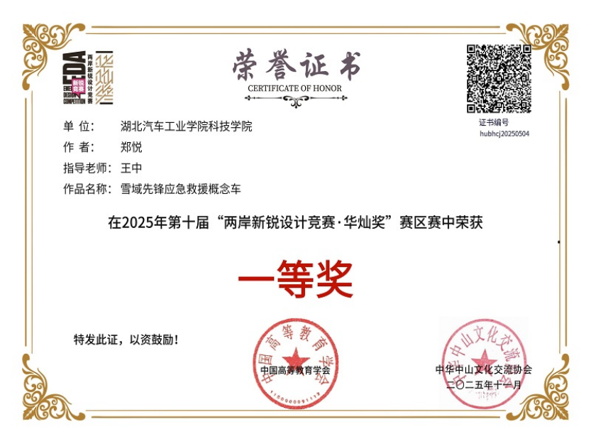 2025年11月25日,第十届“两岸新锐设计竞赛·华灿奖”全国总决赛圆满落幕,我院工业设计专业郑悦同学凭借作品《雪域先锋应急救援概念车》斩获国赛二等奖。该作品由设计学院王中教授指导,已在前期省赛中获得一等奖。